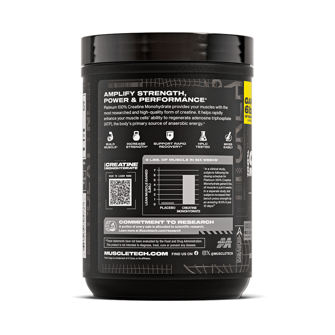 Creatina Platinum de Muscletech ⚡ está diseñada para llevar tu entrenamiento al máximo nivel con 5 g de creatina monohidratada por porción y 80 servicios por envase.