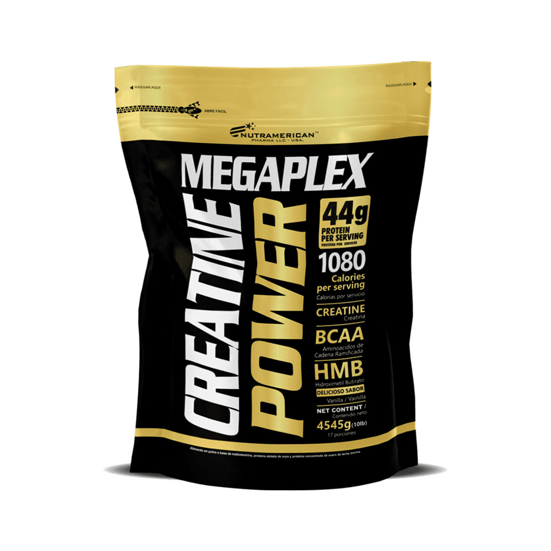Megaplex Creatine Power es una proteína hipercalórica diseñada para maximizar fuerza, volumen y recuperación. Su fórmula combina 3000 mg de creatina, HMB, BCAA, 44 g de proteína y 1080 calorías por porción, junto a carbohidratos de distintas velocidades de absorción para energía inmediata y sostenida.